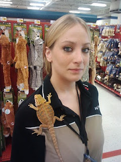 Meet Ashley our new store dog trainer. She also breeds bearded dragons. This young dragon is one of her lady dragons who came for a visit in the store. Apperently she is so mellow that Ashley forgot she was sitting on her shoulder untilk she got to work. That's her story and she's sticking to it!